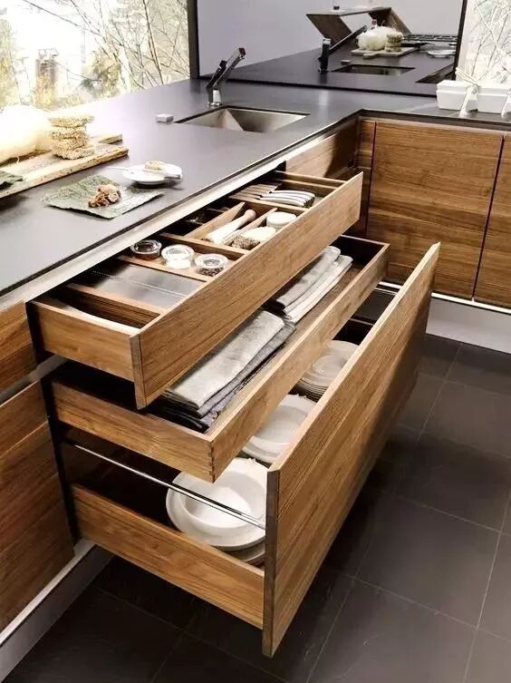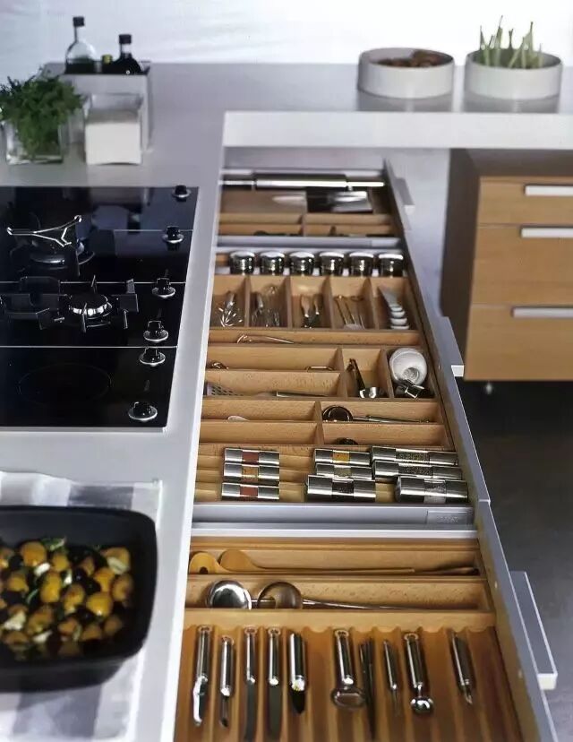 如何有效收纳是厨房设计的一个关键环节,作为厨房最大的收纳空间,柜体与抽屉、拉篮的组合非常受业主的喜欢,这种设计让橱柜空间实现价值最大化。