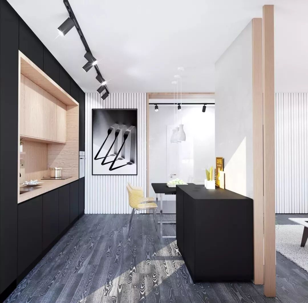 对于做饭比较少的家庭,适合用隐藏式的厨房,将柴、米、油盐,锅碗瓢勺全部都隐藏起来,保持环境的整洁。
